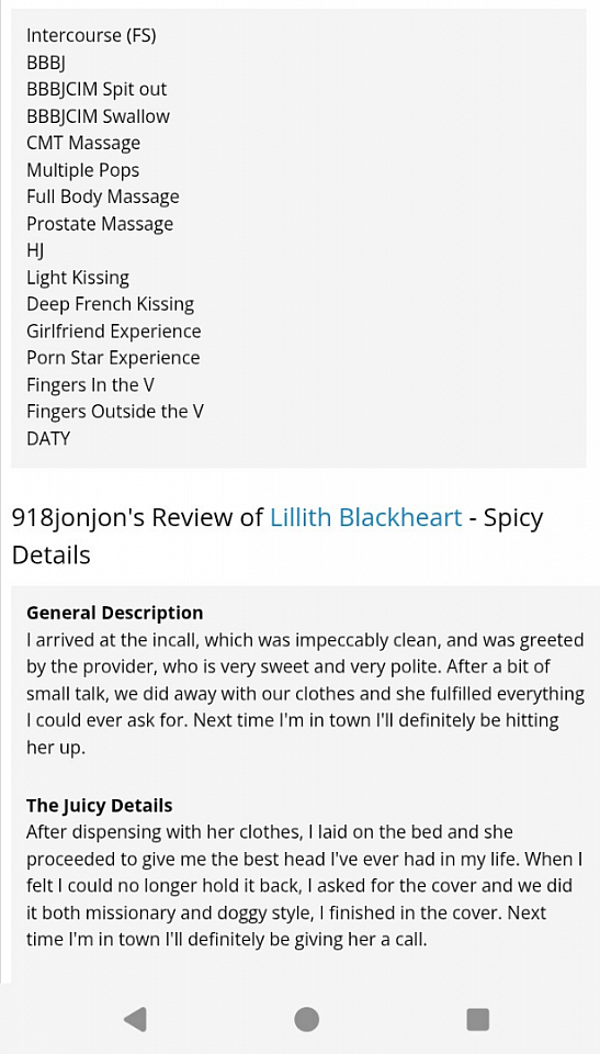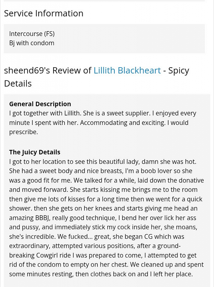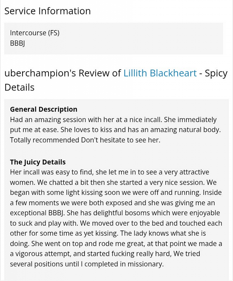 Here is a link to a review on The Erotic Review. You have to be a VIP to read the juicy details, but it will at least give you the gist: