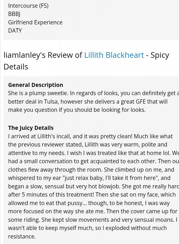 On January 1, 2024, Oklahoma passed a law making reviewing providers a felony; as a result, Eccie deleted the entire Oklahoma page, resulting in the loss of all reviews for OK providers. Because clients were unwilling to give up reviewing providers, Oklahoma clients now post under other states (I do not know which states are currently being used.) Below are screenshots of a review posted about me; it is the only one I was able to find.